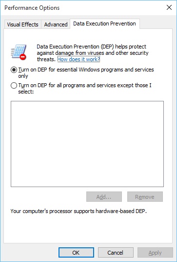 - Wechseln Sie zur Registerkarte Data Execution Prevention.