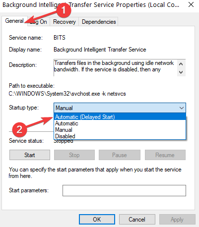 - Stellen Sie sicher, dass auf der Registerkarte Allgemein die Option Automatischer Start (verzögerter Start) ausgewählt ist. Wenn nicht ausgewählt, klicken Sie auf Übernehmen