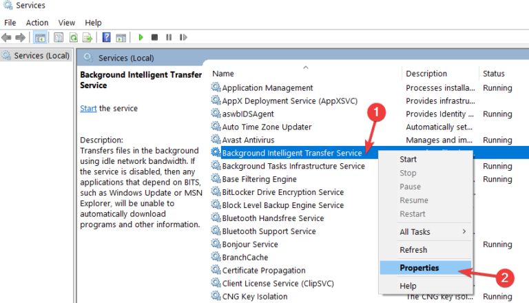 - Klicken Sie mit der rechten Maustaste auf den Dienst BITS (Background Intelligent Transfer Service), und klicken Sie auf Eigenschaften.