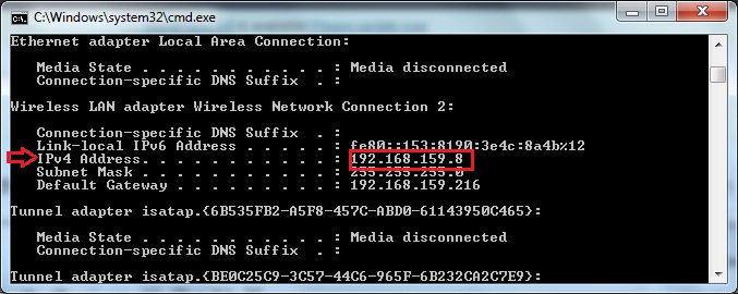 - Suchen und notieren Sie die IP-Adresse, die neben der IPv4-Adresse angezeigt wird, unter Wireless LAN Adapter Wireless Network Connection