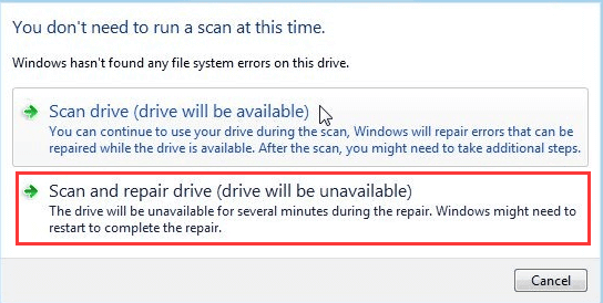 • Wenn der Vorgang abgeschlossen ist, wird möglicherweise das Feld Fehlerprüfung angezeigt. Klicken Sie hier auf Laufwerk scannen und reparieren> Folgen Sie den Anweisungen auf dem Bildschirm, um Fehler zu reparieren.