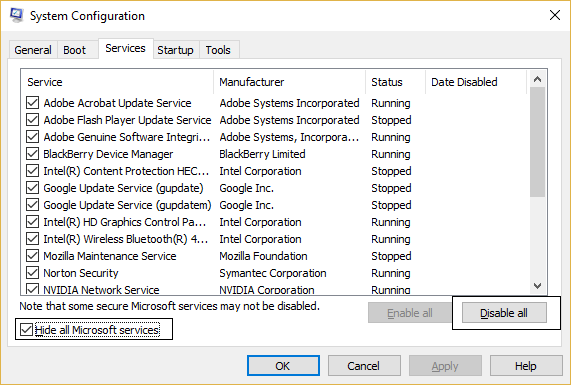 - Klicken Sie auf die Registerkarte Dienste, markieren Sie Alle Microsoft-Dienste ausblenden, und klicken Sie auf Alle deaktivieren