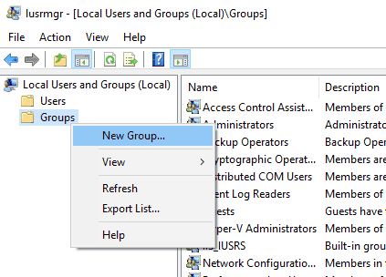 - Wenn sich das Fenster Lokale Benutzer und Gruppen öffnet> wählen Sie im linken Bereich Gruppen> klicken Sie mit der rechten Maustaste auf Gruppen> wählen Sie Neue Gruppe aus.