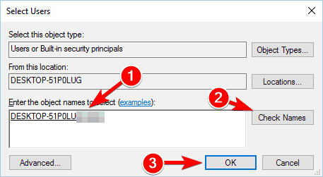 - Dann unter Geben Sie die Objektnamen ein, um das Feld auszuwählen. Geben Sie Ihren Benutzernamen oder die E-Mail-Adresse Ihres Microsoft-Kontos ein. Klicken Sie auf Namen überprüfen, wenn die Eingabe gültig ist, und klicken Sie auf OK