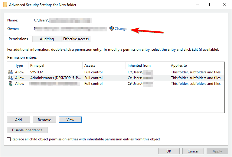 Wie bereits gesagt, sind in Windows 10 viele Ordner geschützt, weshalb Sie ohne bestimmte Rechte nicht auf sie zugreifen können. Wenn Sie jedoch den Besitzer des Ordners ändern, können Sie die Fehlermeldung “Ihnen wurde die Berechtigung zum Zugriff auf diesen Ordner verweigert” korrigiert.