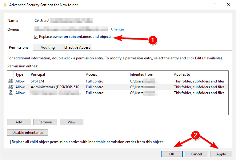 - Jetzt wird der Besitzerabschnitt geändert. Aktivieren Sie die Option Inhaber für Untercontainer und Objekte Klicken Sie auf Übernehmen und auf OK