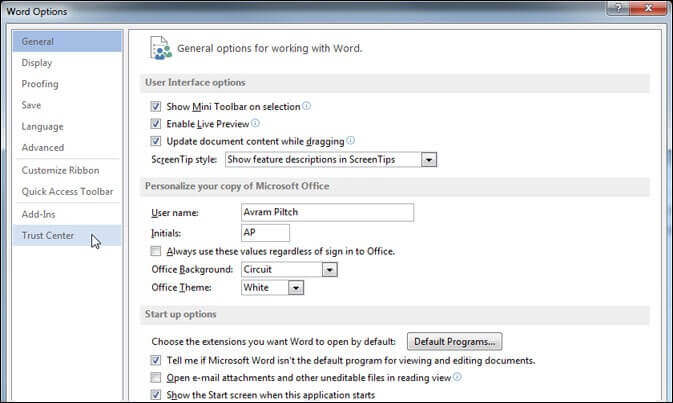 - Wählen Sie im linken Bereich Trust Center aus.
