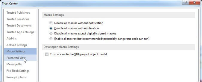 - Aktivieren Sie die geschützte Ansicht für Dateien, die aus dem Internet stammen.