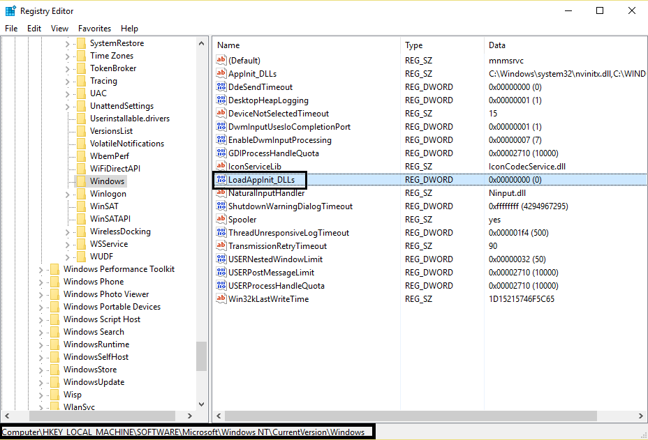 HKEY_LOCAL_MACHINE\SOFTWARE\Microsoft\WindowsNT\CurrentVersion \Windows\LoadAppInit_DLLs
