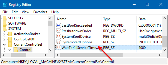 - Und auf der rechten Seite suchen Sie nach WaitToKillServiceTimeout REG_SZ> doppelklicken Sie darauf, um zu öffnen